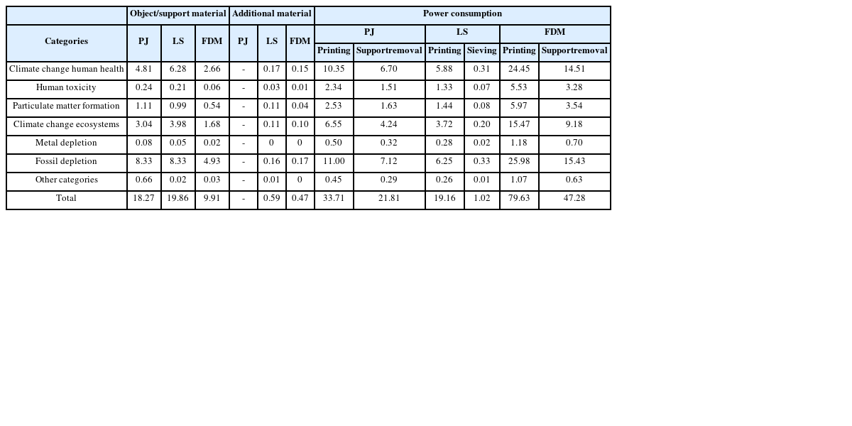 앞서 기술된 조건상에서 각 3D 프린팅 공정별 환경영향평가의 결과 및 해석은 다음과 같다. 출력 시간 및 재료 소비량은 적층제조 공정에 따라 상이한 결과를 얻을 수 있었다. 그 결과, 공정에 소요되는 시간이 짧을수록, 환경 및 인간의 건강에 미치는 영향이 낮게 나타났다. 출력 시간은 전력 소비량과 관련성이 커서, PJ, LS 그리고 FDM의 총 전력 소비량은 각각 916.2 kWh, 666 kWh, 2093.76 kWh이었다.
