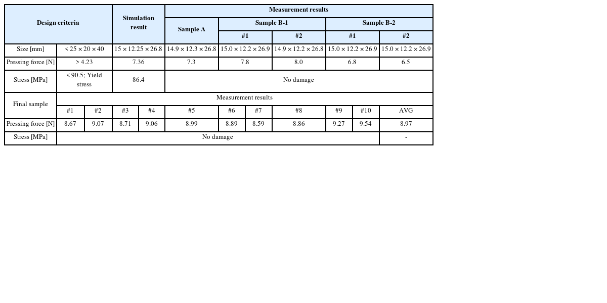 Table 10 satisfy the design criteria such as its size requirement, the pressing force, and the allowable maximum stress. In the cases of the maximum stress, it is difficult to measure with the current measurement system, therefore, it is determined whether there is damage or not when 2 mm of expansion amplitude is applied to the end of the light guide. For further verification, sample B-1 and B-2 are fabricated additionally. Sample A and B meet the design criterion and the difference between the simulation and measurement is within 10%. The pressing force drop of sample B-1 and B-2 is caused by machining error of the light guide. In the final sample fabrication, this machining error is fixed and the pressing force is improved as shown in
