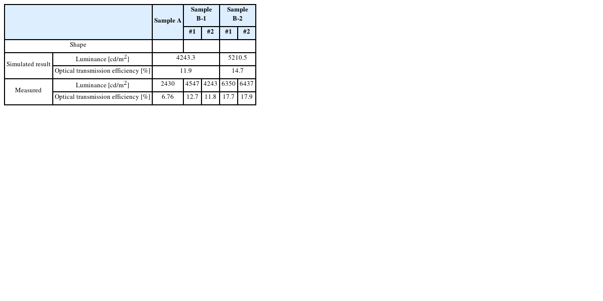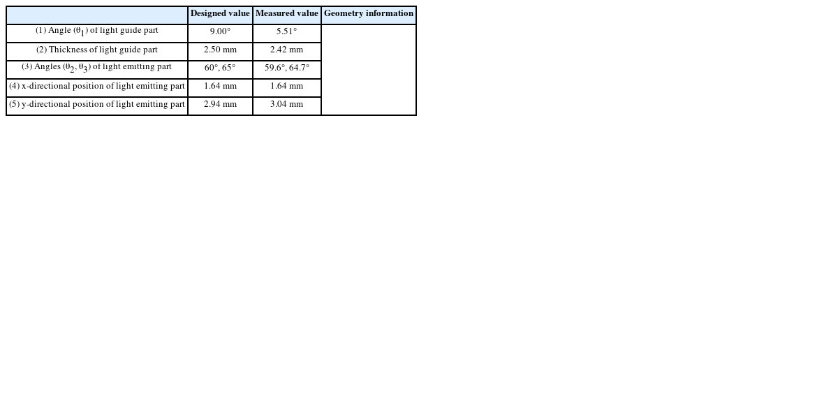 The optical simulation is performed as follows. After modeling using a 3D CAD program, the model is imported from OPTISWORKS, an optical analysis program. Then, the power of the light source and distance between the light source and the light guide are set to 0.057 W and 0.1 mm. When the distance is set to zero, a large simulation error occurs. Therefore, the minimum distance of 0.1 mm is applied for the optical simulation. After defining the optical properties, the 300 million rays for each analysis are used to get accurate results.