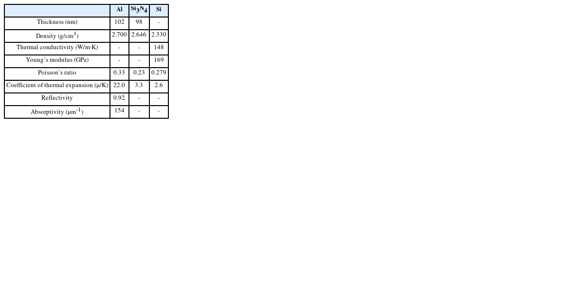 Table 2Material properties used in the numerical analysis. Thermal conductivity values and Young’s moduli of aluminum (Al) and silicon nitride (Si3N4) are fitting parameters