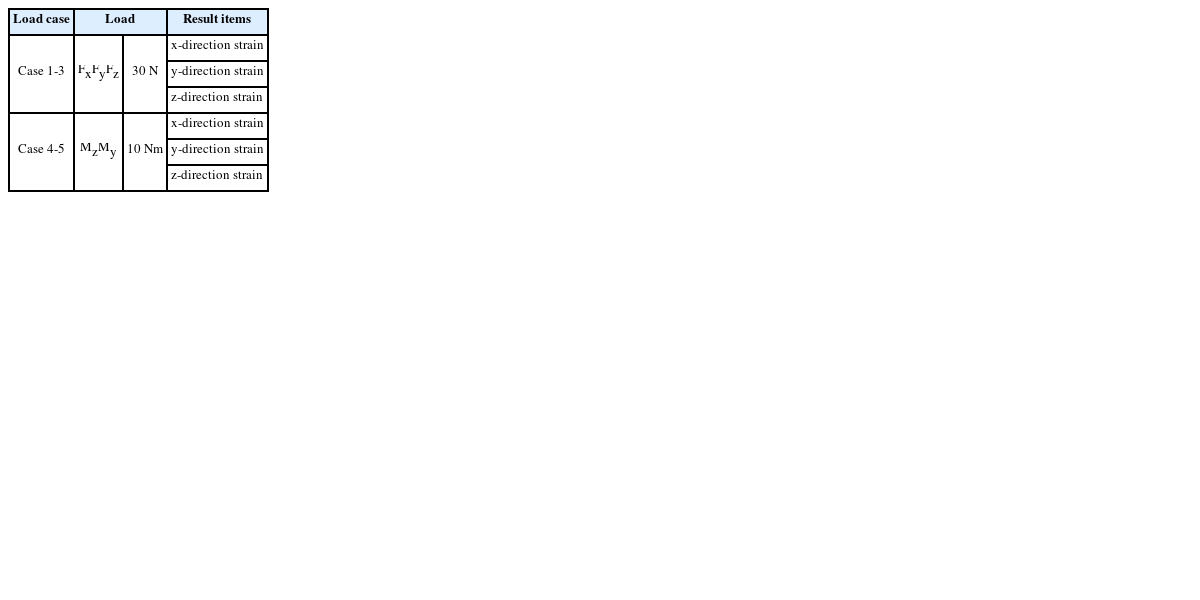 o 회전된 형태로 유사한 변형률 결과를 나타냄을 확인하였다. z축 방향의 하중 부가 시 최대 변형률이 내부 림과 센서 빔 경계면에 발생함을 확인하였다. 해석결과 z축의 경우 x, y축에 비하여 상대적으로 높은 변형률 결과를 나타내지만 게이지 부착위치 선정조건을 고려하여 기계적 간섭이 발생하지 않는 내부 림 경계면에서 2 mm이격된 위치로 선정하였다. 이때, z축 방향 하중측정을 위한 게이지 부착 위치에서 발생하는 변형률이 x, y축에 비해 상대적으로 낮게 나타남을 확인하였다. 모멘트 하중의 경우 M