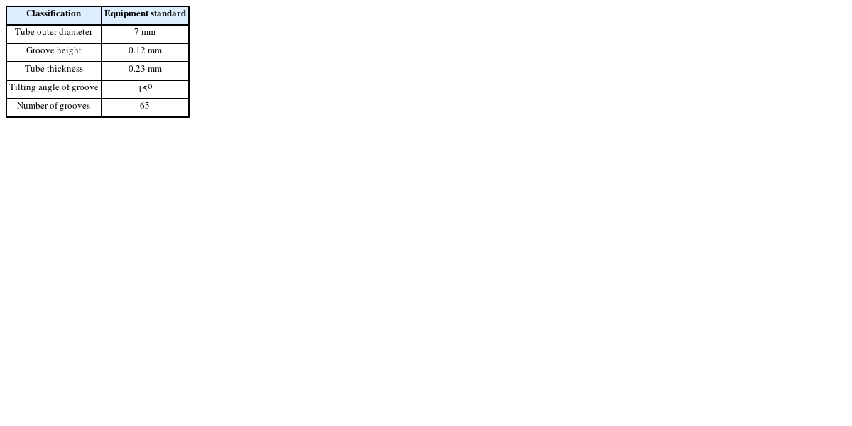 Table 2에 나타낸 것처럼 튜브의 규격으로 그루브 높이는 0.12 mm, 아래 폭은 0.17 mm, 튜브 두께는 0.23 mm, 그루브 나선각은 15