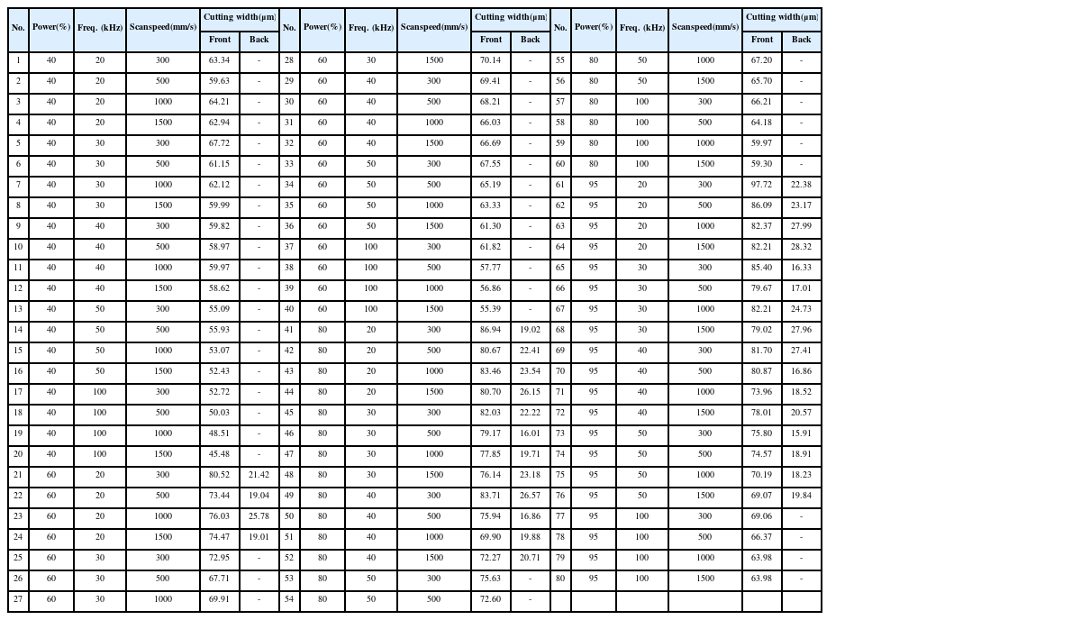 Table 2는 출력, 주파수, 스캔속도 변화에 대한 직선가공 시, 앞면 가공폭(Cutting Width)과 뒷면 가공폭을 나타낸다. 실험은 동일한 조건으로 3회 반복하였으며 가공폭은 평균값으로 나타냈다. 가공폭 뒷면의 값이 없는 것은 절단이 되지 않았음을 의미한다.