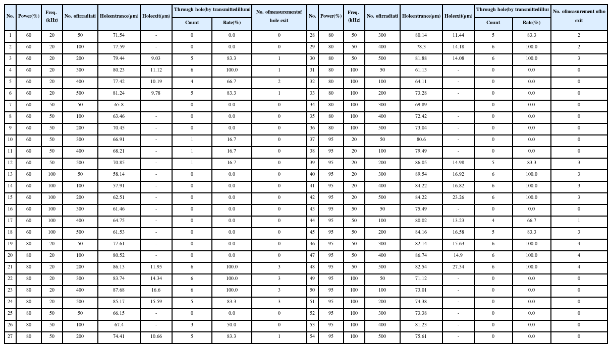 레이저 출력이 60%인 경우에는, 주파수가 20 kHz로 낮은 경우에만 구멍이 관통되었다. 출력이 80 및 95%로 증가하면 주파수가 20과 50 kHz인 경우에 관통되었다. 주파수가 100 kHz인 경우에는 어떠한 조건에서도 관통되지 않았다. 레이저 절단 가공 실험에서 설명한 것과 마찬가지로 구멍가공에서도 레이저 펄스가 인가된 후에 적절한 휴지시간이 있어야 원활히 가공된다. 따라서 주파수가 증가할수록 관통이 안되는데, 출력이 증가하면 관통이 가능하게 된다. 하지만 주파수가 100 kHz인 경우에는 출력이 높더라도 구멍이 관통되지 않았다. 반복조사횟수가 50회인 경우에는 어떤 조건에서도 구멍이 관통되지 않았고, 최소한 100회 이상의 반복조사를 해야 구멍이 관통되었다. 출력이 80 및 95%이고 주파수가 20와 50 kHz인 경우를 살펴보면, 반복조사횟수가 200회 이상이어야 관통횟수가 5, 6회가 되고 출구 측정횟수가 2-4회가 되어 가장 안정적으로 구멍이 관통된다. 출력 60%, 주파수 20 kHz인 경우에는 반복조사횟수가 200회 이상이면 관통횟수가 4-6회가 되지만 출구 측정횟수는 1, 2회에 밖에 되지 않는다. 이것은 레이저 출력이 작아서 출구 구멍이 매우 작게 되어서 많은 경우에 측정이 불가능하기 때문이다.