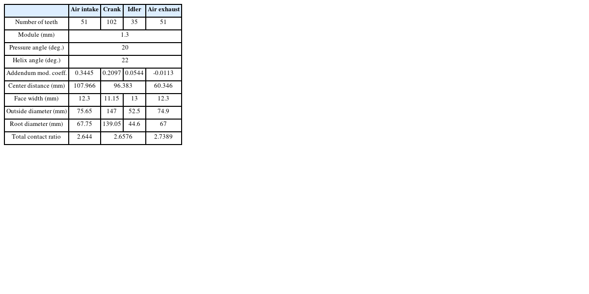 The gear micro-modifications used to reduce tooth corner contact and dynamic excitation of the gear pair, which effect in gear whine noise reduction. Micro-modifications can also be applied on the involute and lead of gear teeth. In this paper, the input torques are too small for the gear train, contrast to no modification (Without gear micro-modification for the gear train) and before modification (Before mod.), only gear profile crown and lead crown are implemented for the gear of air intake and the idler gear after modification (After mod.). As we known, micro-modification parameters cannot be varied individually to evaluate the sensitivity of the durability and NVH performance, and even ideal designs can rarely be manufactured for mass production. Thus, in order to quickly evaluate the results of the nominal modifications, only nominal values of gear micro-modification are used for this gear pair without the consideration of manufacturing tolerance. And the nominal micro-modification parameters are shown in