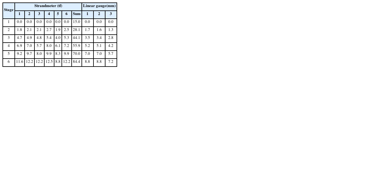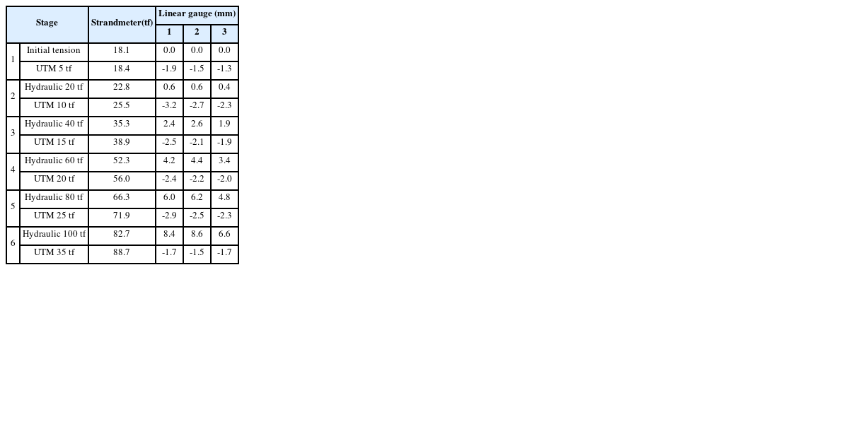Fig. 4(c)) 긴장 순서와 진동현 장력계의 번호는 일치한다. 사용된 와이어 로프는 허용 하중이 20 tf이고 전체 직경이 15.2 mm인 7가닥 꼬임 형태이다. 첫 번째 단계(Stage)에서 기본 긴장 설치 후 진동현 장력계와 선형 변위계(Linear Gauge)의 영점 조정을 하였다. 두 번째 단계부터 여섯 번째 단계까지 각 와이어 로프의 긴장력을 긴장 순서에 따라 강선 인장기를 이용하여 3 tf씩 증가시키면서 진동현 장력계와 선형 변위계의 값의 변화를 계측하였다. 진동현 장력계(1315, ACE Instrument)는 6개의 와이어 로프에 각 1개씩 설치하였고 선형 변위계(543-563, Mitutoyo)는 중앙과 중앙을 기준으로 1 m 떨어진 곳에 모두 3개 설치하였다. 선형 변위계의 번호는 스트류잭에 가까운 쪽을 1번 중앙을 2번 나머지를 3번으로 설정하였다. 센서 값은 NI cRIO(NI 9024, National Instrument)를 통해서 3초마다 한 번씩 주기적으로 수집하였다. 각 단계별로 강선에 긴장력을 증가시킨 후 장력계와 선형 변위계의 변화가 안정되었을 때의 값을 대표값으로 선택하였다.