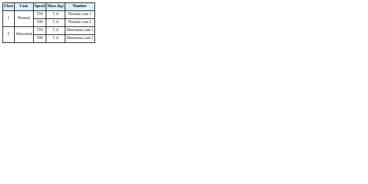분류기를 제작하기 위해 사용되는 데이터는 3.2절에서 설명된 테스트 베드를 통해 수집된다. 캠의 고장을 진단하기 위해서는 고장과 정상 두 가지 클래스 라벨을 가진 데이터를 수집한다. 그리고 분류기는 성형기의 두 가지 구동속도인 250 rpm과 300 rpm 각각의 경우에 대해 두 가지 분류기를 구성한다. 그리고 각각의 분류기를 구성하기 위하여 속도별로 Normal Cam 1과 2 두 가지의 정상캠과 Abnormal Cam 1과 2의 고장캠을 설치하여 성형기의 정상상태와 고장상태의 데이터를 수집하였다. 그리고
