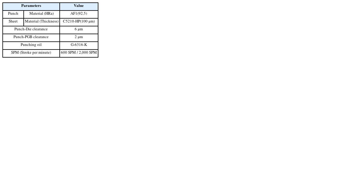 Table 2와 같다. 펀치의 재질은 초경합금으로 스미토모사의 AF1(경도 HRa= 92.5)을 프로파일 가공하여 사용하였고, 피 가공재는 100 μm 두께의 하이퍼 인청동(C5210-HP)을 사용하였다. 펀치와 다이의 유격은 6 μm로 전체 형상구간에 대해서 동일하게 적용을 하였고, 타발유는 일본공작유의 G-6316-K를 사용하였다.