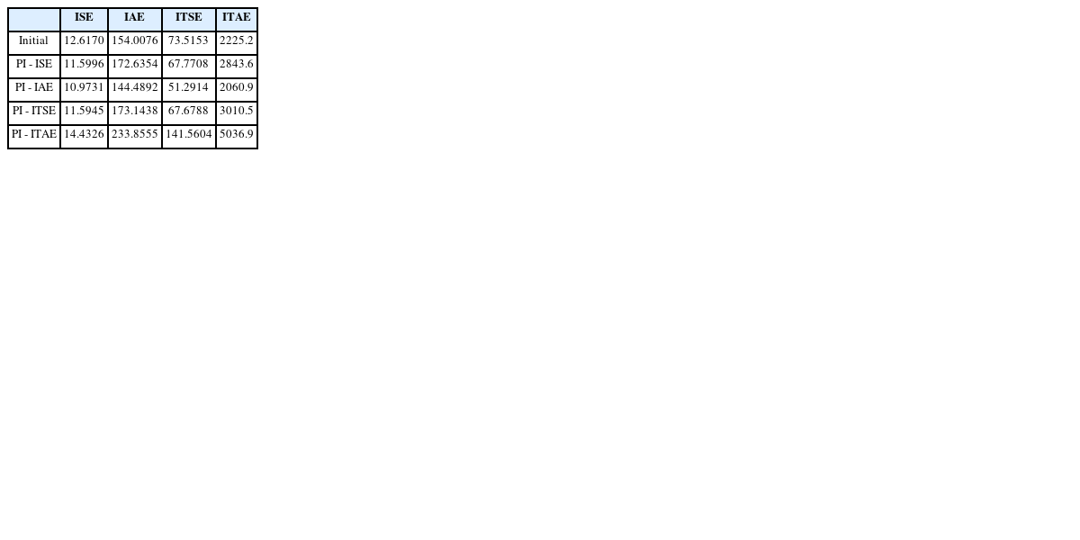 Fig. 8을 통해 확인할 수 있다. 절대 오차 적분값(IAE)을 목적 함수의 오차에 대입하여 최적화를 수행한 결과로 선정된 제어 이득이 평가 기준 모두에서 가장 좋은 제어기 성능을 가지는 것을 확인하였다. 이 때에 계산한 오차, 즉 ISE, IAE, ITSE, ITAE가 처음 시뮬레이션 결과에 비해 각각 13.03%, 6.18%, 29.38%, 7.38%만큼 감소한 것을 알 수 있다.