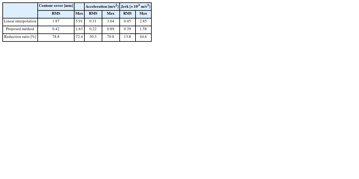 13(c)를 통해 직선 보간 대비 제시된 방법의 가속도와 저크의 전반적인 크기가 감소되었음을 알 수 있다. 이는 직선 공구 경로를 보간할 경우 발생하는 각 연결부에서의 급격한 방향 변화가 제시된 스무딩 방법의 적용으로 완만하게 변환되었음을 알 수 있다. 다시 말해 이 결과는, 직선 보간 방식의 C