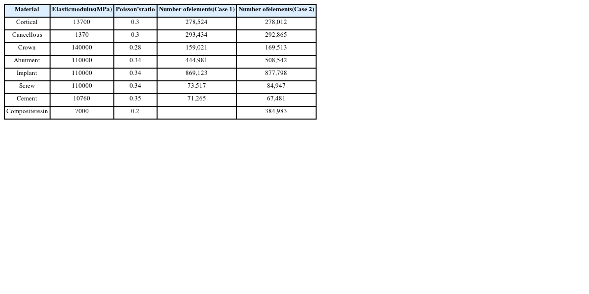 Fig. 2(b)). Cases 1과 2의 경우 지대주와 고정체는 동일한 제품으로 직경 4.3 mm, 길이 9.5mm의 ComOcta 타입의 지대주와 직경 4.8 mm, 길이 12.5 mm의 SS 타입의 고정체를 적용하여 두 가지 케이스로 해석 대상을 구성한다. 해석에서 사용된 임플란트 구성 성분은 오스템임플란트㈜(Osstem Implant, Seoul, Korea) 제품이다.