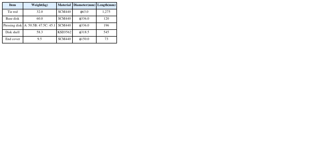 이렇게 결정된 체결력을 기준으로 하여 타이로드의 재질과 크기가 결정되므로, 실제적으로 타이로드 재질의 변경 과정은 쉽지 않다. 그러므로, 이미 설계된 디스크의 재질이나 타이로드의 재질을 변경하는 것을 고려 대상에서 제외해야 한다. 따라서, 본 논문에서는 체결력의 변화를 제어할 요소로 압착 디스크(Pressing Disk)를 선정하였다.