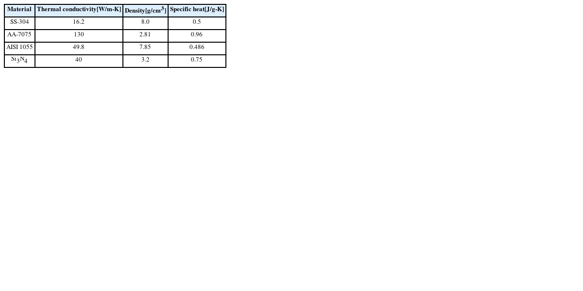 2-K의 열 접촉 전도도를 부여하였다. 상부 코어의 재료는 2.2절 실험에서 사용한 AA-7075와 SS-304를 적용하여 해석을 수행하였다. 평판형 히터의 물성은 기본 재료인 Si