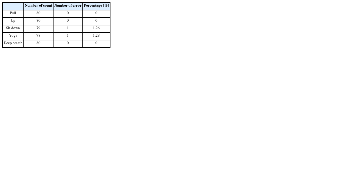 Table 2는 기구를 처음 탑승하는 8명이 상체 운동과 체조 운동을 10번씩 반복하여 오차율을 측정한 표이다. 일부 동작 오차율 측정에서 횟수가 1 또는 2회 감소한 것을 볼 수 있는데, 이는 Kinect 센서가 사용자의 몸이 가려진 부분을 인식할 때 관절의 각도가 흔들려 일어나는 오류이고, 이로 인해 연속으로 Count된 경우가 있어 실험 횟수가 줄어들게 되었다. 이 실험에서 오차율은 최대 1.28%로 동작 인식 알고리즘의 높은 신뢰도를 보여준다.