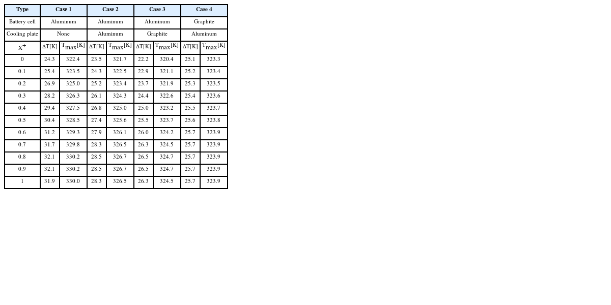 (3) 배터리 팩의 상하부에 냉각판 부착 유무와 셀 및 냉각판의 재질(알루미늄, 그래파이트)에 따른 평균 냉각 성능으로는 Case 1(셀-알루미늄, 냉각판-미부착)에 비해 Case 2(셀-알루미늄, 냉각판-알루미늄), Case 3(셀-알루미늄, 냉각판-그래파이트), Case 4(셀-그래파이트, 냉각판-알루미늄)가 각각 7, 14.5, 11.9% 높게 나타났다.