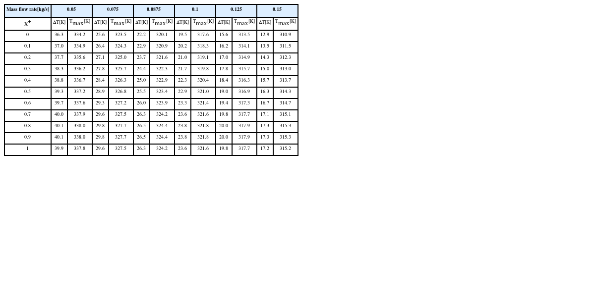 + = 0)에서의 냉각 성능은 0.05, 0.075 kg/s가 0.0875 kg/s에 비해 각각 38.9, 13.7% 낮게 나타났으며, 0.1, 0.125, 0.15 kg/s에서는 0.0875 kg/s에 비해 각각 13.7, 42.3, 72% 높게 나타났다. 냉각이 가장 취약한 셀의 출구 근처 위치(X