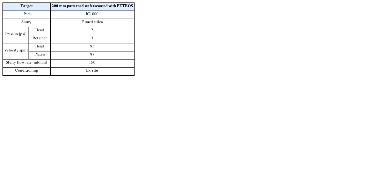 Tang. B7는 디바이스 패턴에서 인접해있는 패턴의 형상이 미치는 영향을 고려하여 유효 패턴 밀도(Effective Pattern Density)를 적용하고 패턴 하부의 연마가 시작되는 시점을 기준점으로 CMP 메커니즘을 나누어 도출한 평탄화 모델을 제시하였다. Vasilev. B8는 Greenwood-Williamson (GW) 접촉 이론을 기반으로 패턴 웨이퍼에서 접촉 계면에서의 유효 돌기 곡률(Effective Asperity Curvature) 및 패턴 밀도를 고려하여 패턴 CMP에 적용할 수 있도록 물리적 모델을 도출하였다. Kim. H9는 산화막 패턴에 대하여 패드 돌기의 변형 특성을 고려하여 접촉 모드에 따라 Ref. 8의 물리적 모델을 세분화하여 최종적으로 재료제거율 식을 제시하였다. 언급한 디바이스 패턴의 평탄화 모델과 관련된 선행 연구의 경우 패턴 밀도를 고려하여 상하부에 따른 연마율을 세분화하여 제시하였으나 돌기의 지형학적 특성이 미치는 영향은 배제되어 있거나, 패턴 밀도 및 패드 돌기의 기계적 특성을 고려하여 패턴의 상하부 및 돌기의 변형에 따라 접촉 모드를 세분화하여 제시하였으나 공정 시간에 따라 변화하는 돌기 높이 분포의 변화에 대응할 수 없다는 한계점이 존재하며 패턴 하부 영역의 너비가 패드 돌기의 직경보다 좁은 미세 패턴에서의 접촉 메커니즘에 대한 연구가 필요하다.