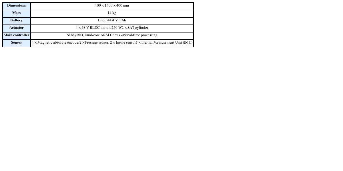 전체 무게는 배터리 포함하여 약 14 kg이며 외부의 동력원 없이 독립적으로 구동할 수 있다. 허리관절에는 고성능 BLDC 모터와 50 : 1 하모닉 감속기를 구동기로 선정하였으며, 무릎관절에는 단동다단실린더가 사용된다. 유압력은 EHA로부터 생성되며 NI myRIO 제어기에서 모터 및 유압제어가 이루어진다. 마지막으로 허리관절과 무릎관절 각도 측정을 위한 절대식 엔코더, 등판의 기울기 측정을 위한 IMU, EHA 유압력을 측정하기 위한 유압센서, 착용자 보행 상태 확인을 위한 발 센서 등 다양하고 많은 센서가 사용된다. 참고로, 로봇의 전반적인 사양을