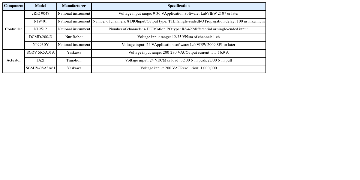 Fig. 11과 같다. 제어기는 National Instrument사의 cRIO-9047을 사용하였고, 본 제어기에 모터 및 모터 드라이버를 연결하여 모션 모듈과 함께 사용하였다. 좌우 회전 시 발생하는 토크가 최대 4.5 N·m이므로 이 값보다 큰 토크의 서보 모터를 사용하기 위해 토크가 2.39 N·m인 Yaskawa사의 SGMJV-08A3A61 모터에 20 : 1의 감속기를 추가하여 좌우 회전 시 예상하지 못한 큰 토크가 발생하여도 견딜 수 있는 모터 및 감속기를 좌우 회전용 모터로 선정하였다. 또한 리니어 액추에이터의 경우 더 많은 하중이 발생할 경우를 대비하여 계산된 442.51 N보다 큰 2,000 N의 Timotion사의 TA2P K Type 모터를 사용하였다. 설계된 물 분사 로봇의 하드웨어 정보는