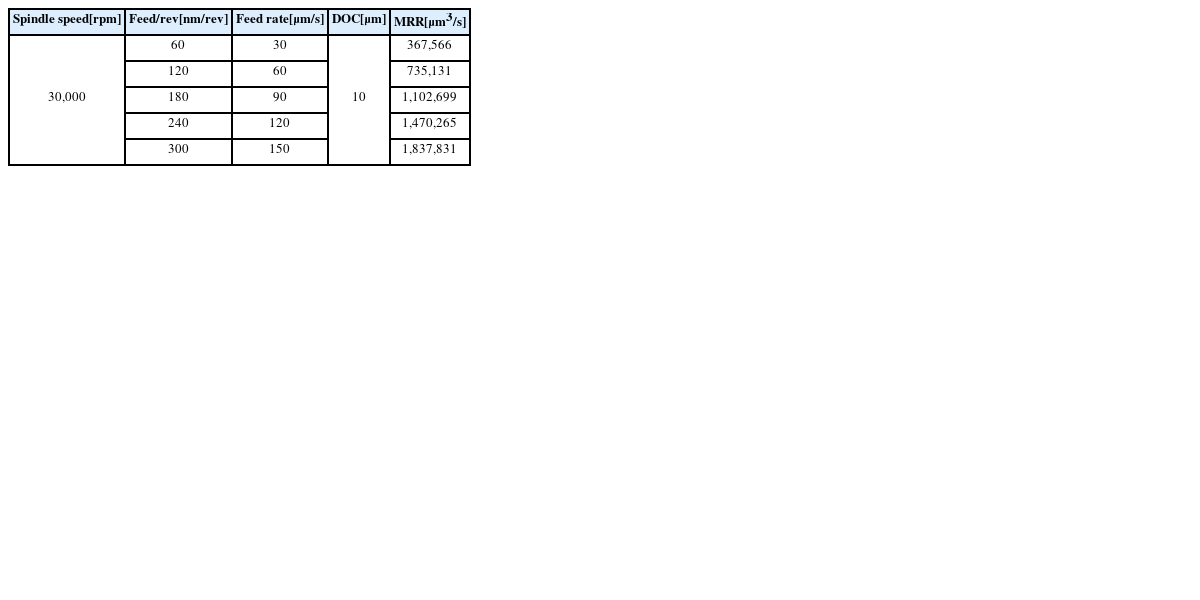 Table 1에서 볼 수 있듯이 회전당 이송량(Feed per Revolution)이 수십에서 수백 나노미터에 불과하여 높은 표면 조도와 안정적인 가공을 기대할 수 있다