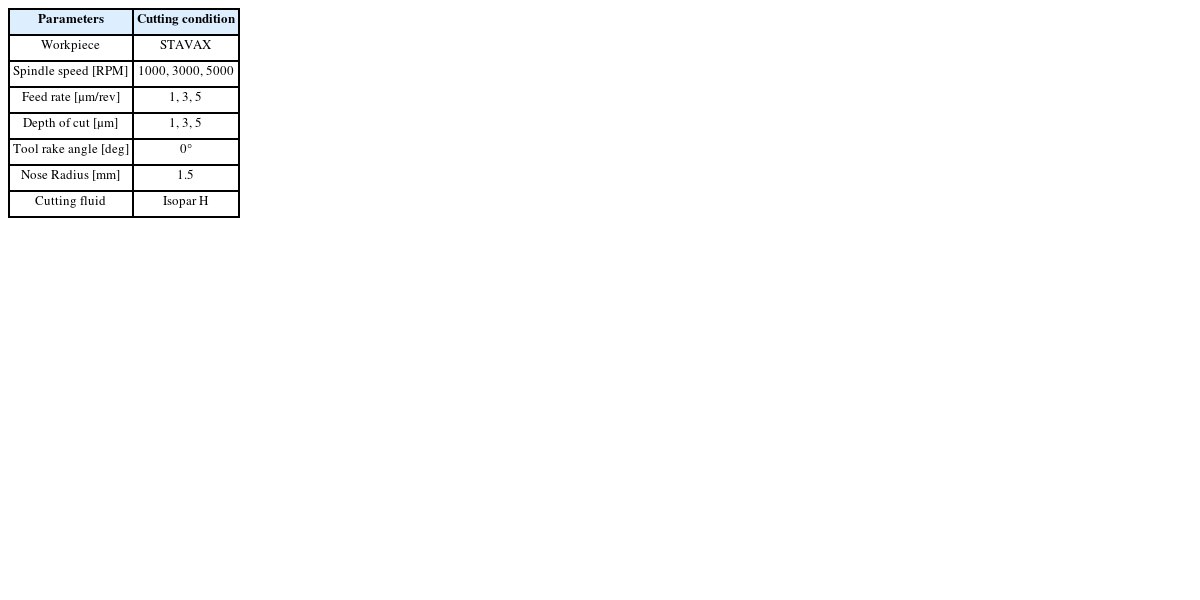 본 실험에서는 1차 가공인자를 Table 1과 같이 변화시키며 실험하였다. 실험 조건은 표면의 정밀도를 최상으로 하기 위하여 변경되는 조건 이외의 조건은 고정하였다. 스핀들 회전속도 5,000 RPM, 이송속도 1 μm/rev, 절삭 깊이 1 μm으로 고정하여 실험하였다. CBN 공구는 CBN Content 50%, Average Grain Size 1.5 μm이며, 경사각 0°, 공구 반지름 1.5 mm 공구를 사용하였다. 경도 측정은 가공 표면의 손상을 최소화하며, 표면의 변화를 관찰하기 위해 최소깊이로 표면 경도를 측정하였다. 따라서 미소경도시험기(Micro Hardness Tester)를 이용하여 하중 0.05 kg, 유지시간 5초로 설정하여 측정하였다. 측정 위치는 공구마모의 영향을 최소화하기 위해 외곽 1 mm 구간 임의의 4곳을 측정하였다. MODE 렌즈에 적용되는 렌즈용 금형강의 초정밀 가공 특성에 대한 연구를 위하여 지름 50 mm STAVAX 테스트 시편을 제작했다. Table 2는 STAVAX의 화학조성을 나타낸 표이며, 경도는 314 Hv이다.