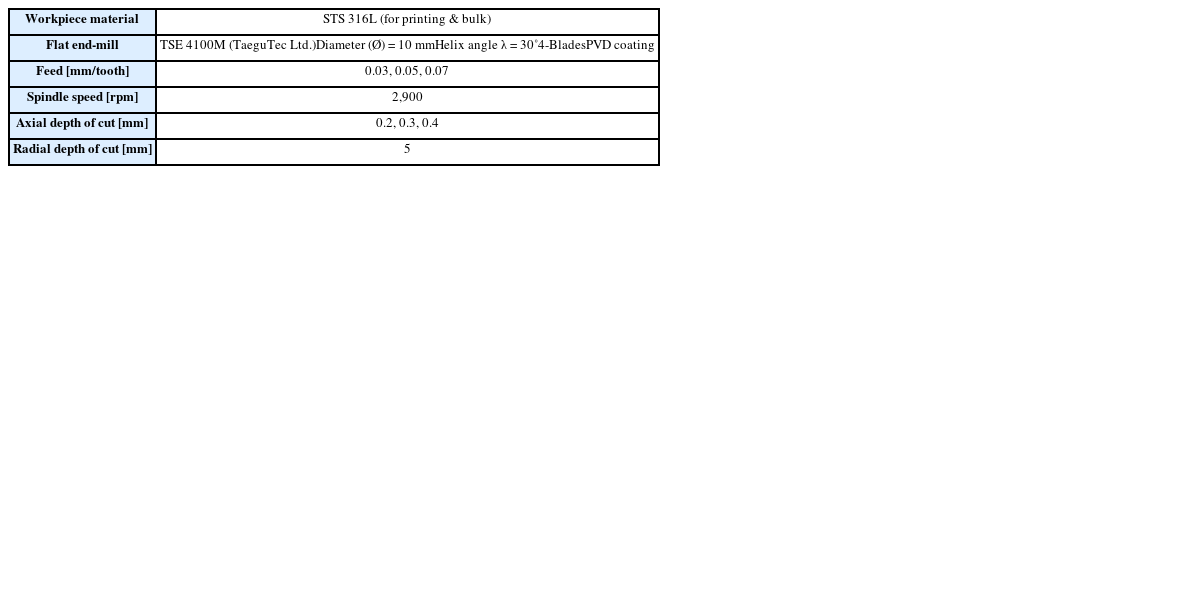 Table 2와 같이 터치프로브가 장착된 DMG Mori사의 5축 머시닝 센터에서 진행하였다. 벌크와 출력물의 가공성 비교평가 및 정삭 조건 수립을 위한 실험은