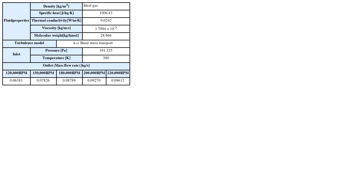 실제 터보차저 압축기의 운전 상황을 구현하기 위해 초기 경계조건으로 입구와 출구 모두 대기압으로 설계하였다. 5가지 회전수에 대한 유동해석을 수행하였고, 해석의 수렴성을 위해 출구 질량 유량을 추가적으로 고려하여 연속 방정식을 만족시켰다. 질량유량은 개발 및 제작사인 ㈜K사의 시험 데이터를 활용하였으며, 휠의 회전 운동을 표현하기 위해 MRF (Multiple Reference Frame) 기법을 사용하여 유체가 회전하는 효과를 부여하였다.