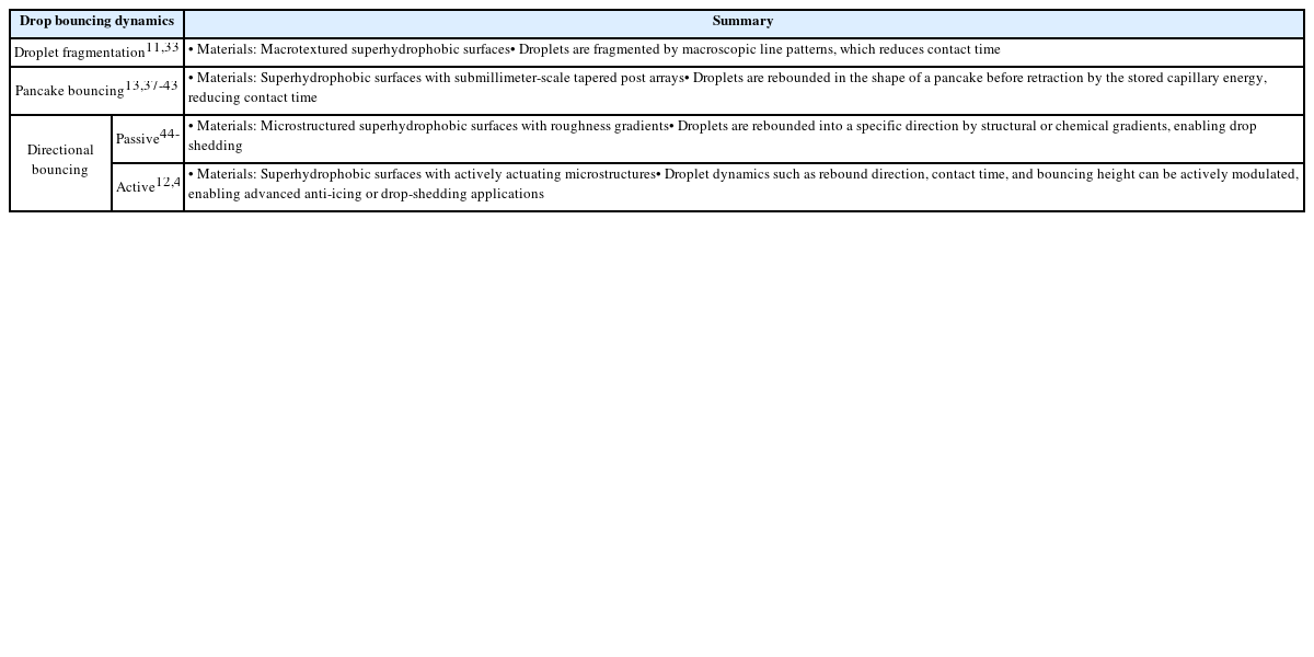앞서 언급한 바와 같이, 표면에 충돌한 액적의 반동 현상 과정에서의 접촉 시간 및 접촉 면적은 표면과 액적 사이의 열전달과 직결되며, 이는 표면의 방빙 성능을 향상시킬 수 있는 주요 요인이다. 최근, 액적 반동 현상이 표면 미세구조의 크기 및 형상에 따라 조절이 가능하다는 사실이 밝혀짐에 따라, 다양한 액적 반동 현상을 유도함으로써 액적과 표면 사이의 접촉을 최소화하여 동결을 방지하기 위한 연구가 활발히 진행되고 있다. 이러한 액적 반동 현상 기반의 방빙 표면 기술들 중 대표적인 연구로는 1) 액적 분열 현상(Droplet Fragmentation) 기반 방빙 표면 기술, 2) 팬케이크 반동 현상(Pancake Bouncing) 기반 방빙 표면 기술 그리고 3) 방향성을 지니는 액적 반동 현상(Directional Bouncing) 기반 방빙 표면 기술이 있다. 이 항목에서는 이러한 새로운 액적 반동 현상에 대한 메커니즘 및 이에 따른 표면의 방빙 성능에 대해 분석한 연구들을 소개하고자 하며,