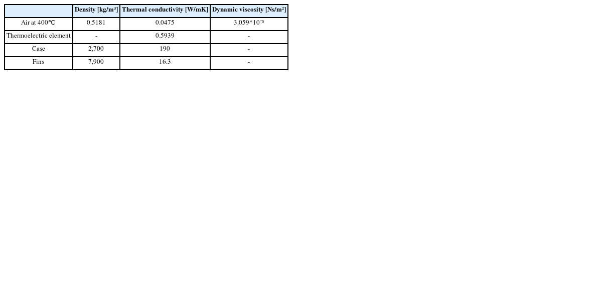 14를 이용하였다. 열전발전 스택의 입구 및 출구의 온도차와 차압을 확인하기 위해 냉각 장치는 해석에서 고려하지 않았으며, 완전 발달 유동이 이루어지도록 단위 스택 입구단에서 300, 출구단에서 100 mm의 거리를 두고 고온부 배관을 모델링하였다. 고온부 배관 크기에 비해 열교환핀의 두께와 유로 폭이 작아 효율적으로 격자를 생성하기 위해 해석의 정확도가 높은 육면체를 우선적으로 생성하는 Hex-Dominant Meshing을 적용하였다. 열교환 핀의 격자수는 사례연구에 따라 52만개-120만개 사이이며, 고온부 배관 전체 격자수는 100만개-360만개 수준이다. 해석에는 배기가스 대신 공기를 사용하였으며, 온도 변화에 따라 변하는 상태량인 열전도도(Thermal Conductivity)와 동점성계수(Dynamic Viscosity)는 400과 270°C의 평균값을 적용하였다. 또한, 400°C의 배기가스가 고온부 배관에 지날 때 열전소자 PGM-TK-1 모델