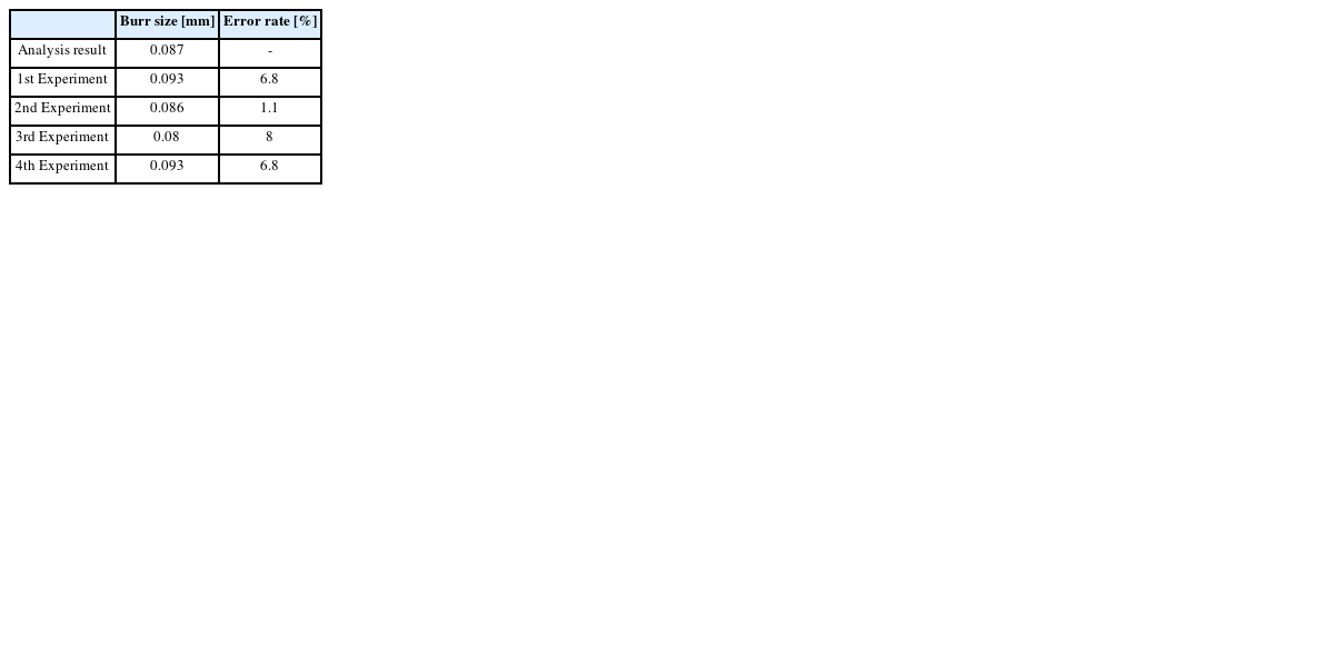 Fig. 10은 피어싱 및 블랭킹 공정 실험이 끝난 플레이트의 용이한 측정을 위해 와이어 커팅(Wire Cutting)한 시편이다. 위 측정 장비를 사용하여 와이어 커팅된 시편 4개의 버 높이 측정을 진행하였고, 생성된 버의 높이는 각각 0.093, 0.086, 0.093, 0.08 mm로 측정되었다. 이는 플레이트 두께인 3mm의 3.1, 2.8, 3.1, 2.6%이다. 실험 결과 2.1장에서의 피어싱 및 블랭킹 성형 해석 결과와 각각 6.8, 1.1, 6.8, 8%의 오차가 있음을 확인할 수 있었다.