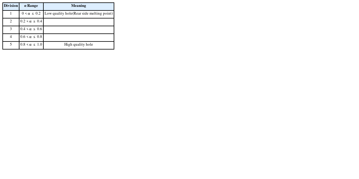 α값의 최소 범위인 0-0.2 영역(Division 1)은 소재 후면에 용융이 발생한 최소 영역을 나타낸다. 이때 전자빔에 의한 소재의 용융 깊이는 소재의 두께 값과 동일한 값을 지니게 된다. 따라서 Division 1 영역에서의
