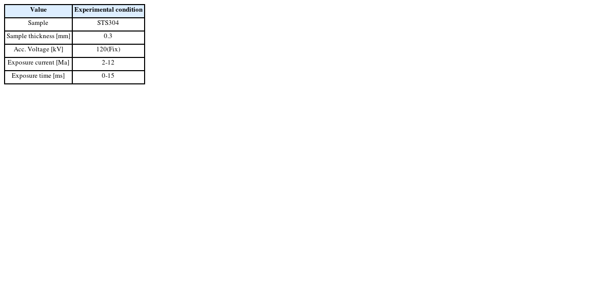 Table 1은 장비의 사양 및 실험에 활용한 조건을 나타낸다. 전자빔의 가속전압은 장비의 권장 최대사양인 120 kV로 고정하여 활용하였다. 전자빔 미세 홀 가공은 전자빔의 단일 펄스 하나당 소재에 하나의 홀이 형성되는 메커니즘을 지닌다. 이에 따라 실험은 단일 펄스의 전자빔을 활용하여 진행하였다. 미세 홀 가공 시 전자빔의 조사량에 따라 소재에 형성되는 용융 직경 및 미세홀의 크기가 결정된다. 본 연구에서는 100-1,000 μm 크기의 미세 홀 가공을 목표로 하여 조사전류(Exposure Current)는 1-20 mA, 조사 시간(Exposure Time)은 1-20ms 이내로 변화시키는 전자빔 조사 조건을 활용하였다. 전자빔의 최적 집속을 위해 가공거리(Working Distance)는 45 mm로 최소화하여 실험에 활용하였다. 집속 렌즈의 전류값은 최소 가공거리에 맞추어 실험에 활용하였다.