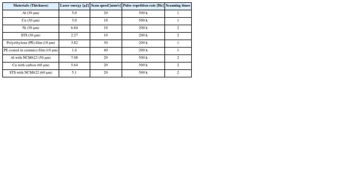 유연 배터리를 구성하는 물질들과 극초단 레이저 간의 상호 작용 조사를 통해 레이저 절단 시 각 물질들이 열적 손상을 최소화하면서 절단 공정 시 레이저 파라미터를 선정할 수 있다. 유연전극용 금속 포일로 사용되는 알루미늄, 구리, 니켈, 스테인리스강과 분리막으로 사용되는 폴리에틸렌 계열 원단인 투명 필름과 폴리에틸렌 계열 원단에 세라믹 코팅이 부착된 불투명 필름까지 다양한 물질들의 최적화된 레이저 파라미터를 선정하는 실험을 진행하였다.