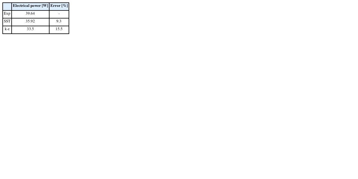 풍력터빈의 출력의 경우 k - ε 난류 모델보다 SST 난류 모델이 더 정확한 예측 결과를 보여주었다. 정격 풍속 이하의 경우 SST 모델과 실제 풍력터빈의 출력 오차율은 0.7%로 매우 작았지만, 정격 이상의 경우 9.3%의 오차율을 보였다. 이는 정격 풍속 이상에서는 풍력터빈은 블레이드 피치제어에 의해 피치각 변화가 발생하지만, 이와 같은 피치각 변화를 CFD 해석에서는 구현하기 어렵기 때문에 발생한 것으로 판단된다.