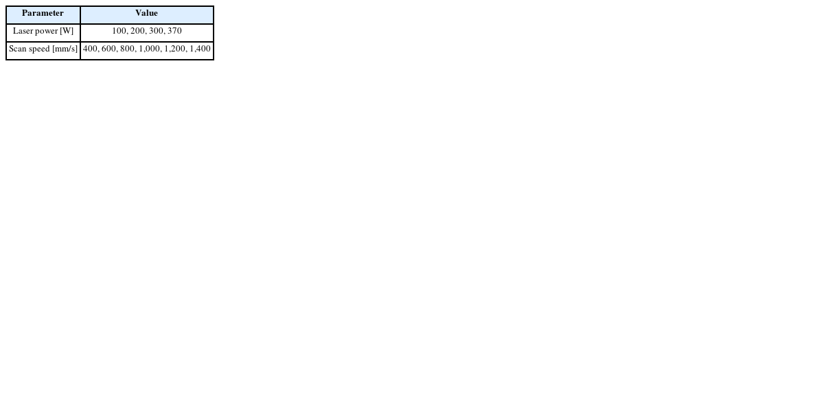 4은 150, 180W의 레이저 파워에서 스캔 속도 변화에 따른 단일 트랙 스캔 분석을 수행하였고 Line Energy Density (LED)를 1.5-1.875 J/cm, 해치 간격(h)을 50 μm로 설정하여 연속적인 비드와 최대 밀도를 확보할 수 있음을 보였다. 또한 Kempen 등