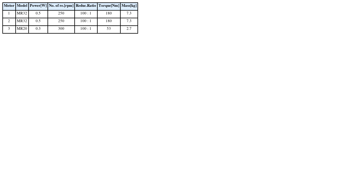 Table 1은 관절1-3 모터의 사양을 나타내고, 이것은 그리퍼와 공작물의 무게와 각 관절의 회전 토크를 고려하여 결정하였다. 관절1 모터와 관절2 모터는 동일한 것을 사용하였다.