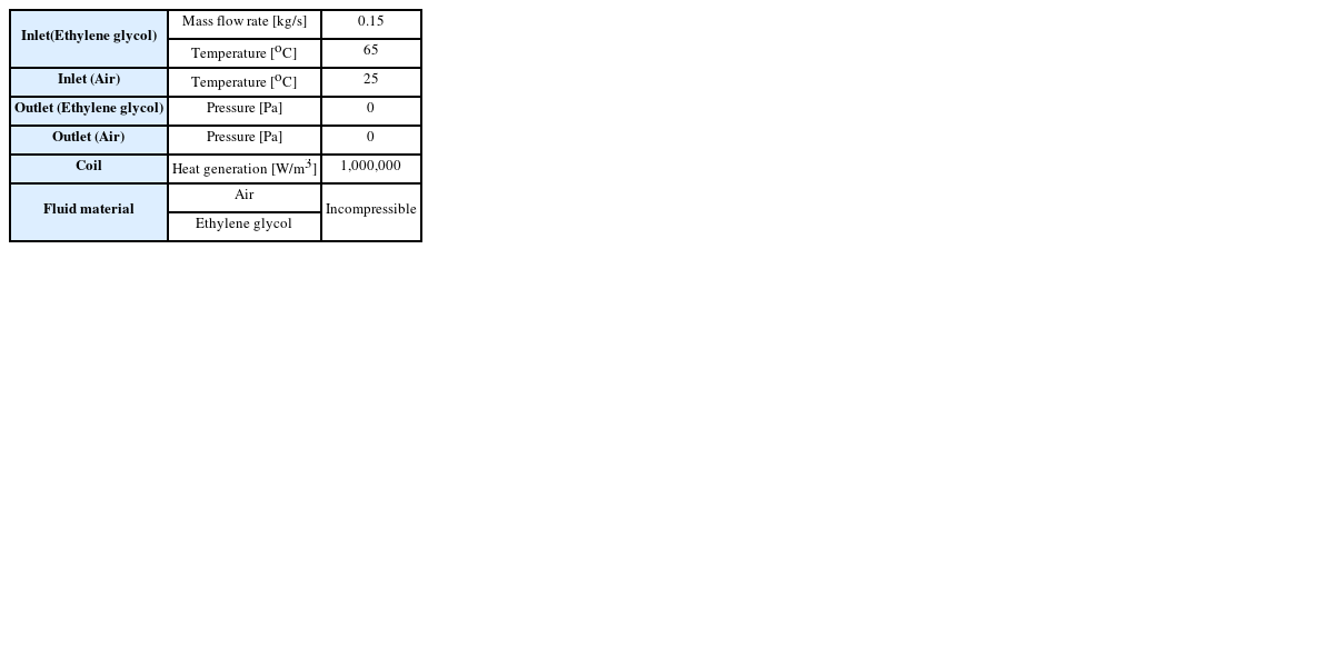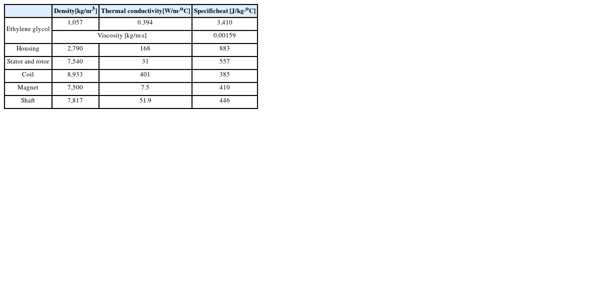oC를 출구에서의 조건으로 공기 유동장과 냉각 채널 모두 대기압을 기준으로 한 0 Pa의 계기압을 주었다. 냉각 채널 내 유체의 물질은 자동차의 냉각수로 많이 사용하는 Ethylene glycol (EG)로 선정하였고, 하우징의 재질은 Aluminum Alloy 195, 코일은 Cooper, 자석을 Nd (Dy) FeB, 축은 Carbon-Silicon Steel, 회전자와 고정자는 NO30 Steel의 소재를 입력하였다.