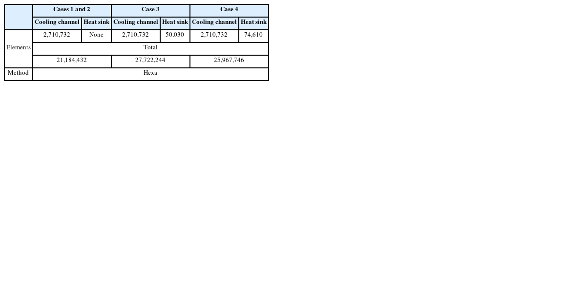 유동해석 조건은 열전달 해석 및 유체 유동해석을 위하여 운동량 보존 법칙, 질량 보존 법칙, 에너지 보존 법칙을 적용하였고, ANSYS FLUENT V20.1을 활용하여 비압축성 정상상태 유동해석을 진행하였다. 전도 및 대류 열전달 해석 커플링을 하여 구조를 가진 고체와 내부 혹은 주변 유체 유동을 상호작용하여 해석하는 FSI (Fluid Structure Interaction)를 활용하여 열변형 해석을 진행하였다. 내부 유동의 최대 Reynold 수는 5,200으로 계산되었고, 이에 따라 난류 유동해석을 진행하였으며 경계층 흐름에 대한 더 많은 계산을 하고, 해석의 정확도를 향상시키기 위해 난류모델 k-omega SST를 사용하였다. 냉각판의 재질은 메탈 하이브리드 소재를 적용하였고, 냉각 채널에는 알루미늄과 메탈 하이브리드 소재를 적용하였다. 초기 조건으로 냉각수의 온도는 차량 운행 중일 때와 유사한 조건으로 해석을 수행하기 위해 65