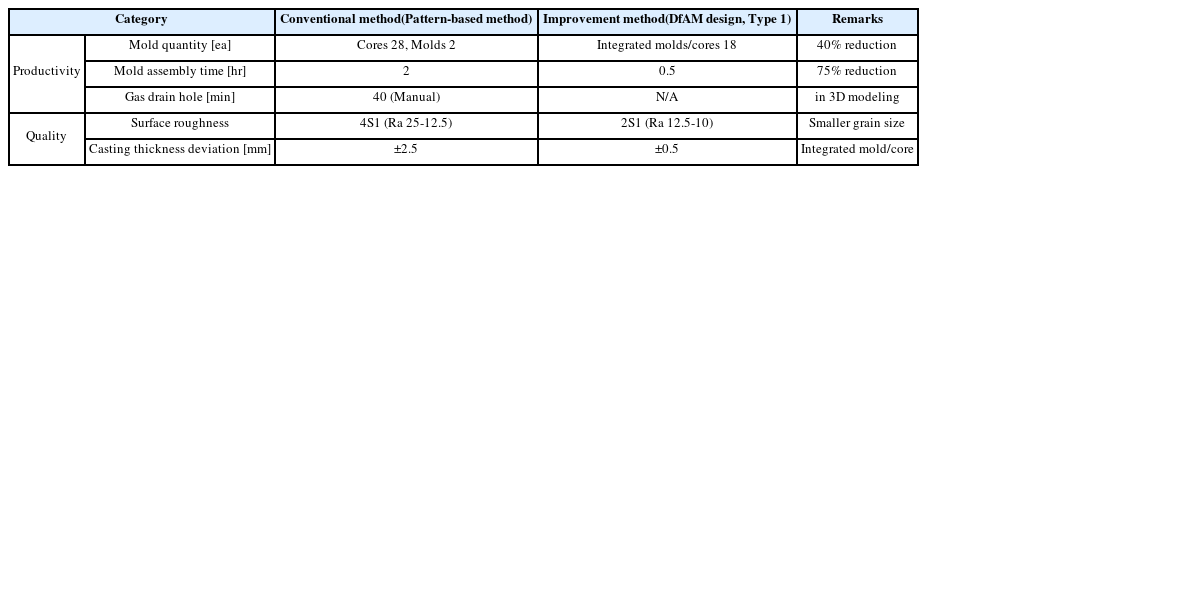 Table 1과 같다. 기존 방식의 경우에는 외형 몰드 2개와 중자 28개로 총 30개 수량으로 조립 및 합형을 진행해야 하지만, 본 연구에서 제안한 유형1 방식을 적용한 경우에는 부분 일체화 몰드를 포함하여 총 18개의 수량으로 조립 및 합형 작업을 진행할 수 있었다. 즉, 40%의 몰드/중자 수를 줄이는 효과가 있고, 이로 인한 합형 시간은 기존 방식 2시간 대비 유형1 방식은 0.5시간으로 75% 이상 단축 효과를 얻을 수 있었다. 가스빼기 홀의 경우에는 목·금형 방식에서는 40분간의 수작업이 필요하나, 유형1 방식에서는 3D 모델상에 선반영하여 별도의 작업이 필요치 않았다. 품질 관점에서는 주요 부위의 주물살 두께 편차를 측정한 결과, 목·금형 방식에서는 ±2.5 mm 이내인 반면, 유형1 방식에서는 ±0.5 mm 이내로 측정이 되어 우수한 품질 확보가 가능함을 확인하였다. 이는 주요 부위의 형상이 일체화 설계 제작되어 합형 공차가 제거되었기 때문으로 설명할 수 있다. 또한, 샌드 3D 프린팅에서 사용되는 주물사의 입도가 기존 방식의 주물사 입도보다 매우 곱기 때문에 비가공면의 조도 품질 관점에서도 유형1 방식으로 제작한 제품이 우수하였다.
