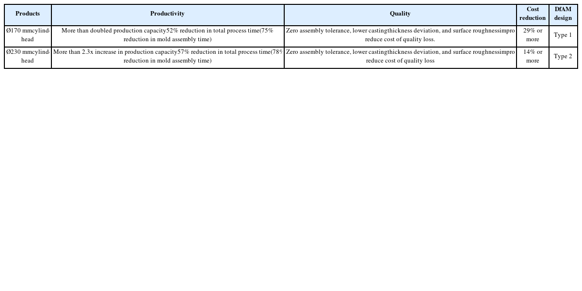 Table 3과 같이 금속 제품 양산 공정의 생산능력 증대, 생산원가 절감, 품질 향상 및 손실 비용 저감 등 샌드 3D 프린팅 기술 융합 공정 솔루션의 효과성을 제시한다.