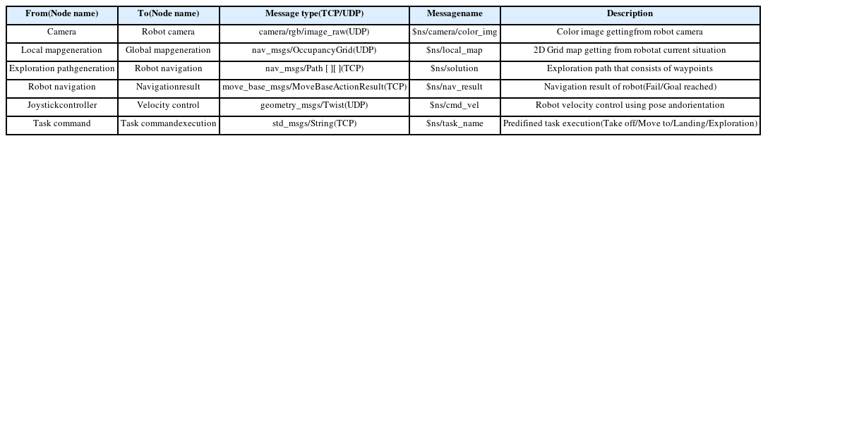 Table 1과 같이 6종류로 정의된다. 여기서 영상정보는 로봇 운용에 가장 필요하나 정보의 크기가 상대적으로 크기 때문에 UDP 통신을 통해 전송된다. 로봇의 내부의 센서로 획득하여 생성한 현재 위치 및 지도 정보는 UDP 통신을 통해 전송되며, 통합관제시스템의 전역지도 생성 노드와 연계되어 시각화된다. 로봇 자율 이동을 위한 네비게이션 명령과 제어신호는 주기적인 명령이 아니므로 TCP 통신을 이용하여 송수신한다. 오퍼레이터는 로봇을 제어하는데 조이스틱을 사용할 수도 있으며, 조이스틱의 각도 변화가 로봇의 모터 회전 속도에 반영되어 위치와 방향값을 생성한 후 UDP 통신을 통해 전송되는 방식이다. 마지막으로 미리 정의한 로봇의 임무인 이륙, 착륙, 이동 등의 명령은 TCP 통신을 통해 해당 로봇으로 전송된다. 각 로봇을 구분하기 위해 ROS 메시지 이름에는 네임스페이스(Name Space, $ns)가 적용된다.