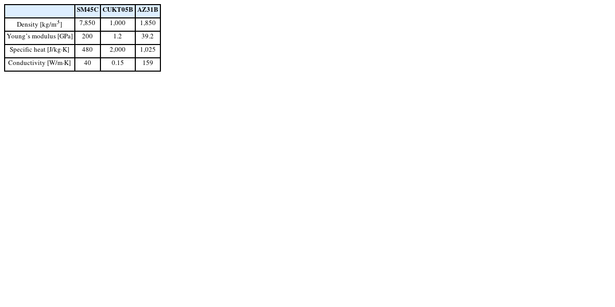 Table 2는 해석에 사용된 재료 열물성이다. 금형 소재의 경우 온간 굽힘 공정에 있어 그 온도가 크게 변하지 않는다고 가정하여, 온도에 따른 물성은 고려하지 않았다.