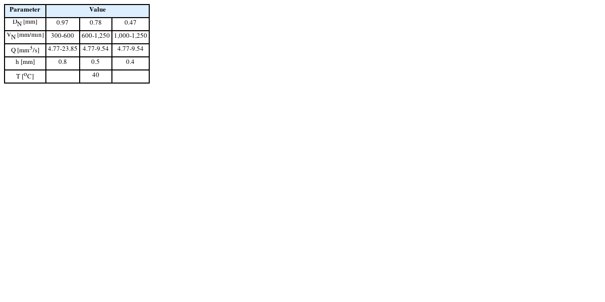 이 결과를 이용하면 서로 다른 내경을 갖는 노즐로 다양한 폭을 가지는 재료를 압출하여 성형하는 것이 가능하다. 선정된 성형 조건들 중 가장 큰 값을 가지는 선폭은 3.865이고, 가장 작은 값을 가지는 선폭은 0.485 mm이다.