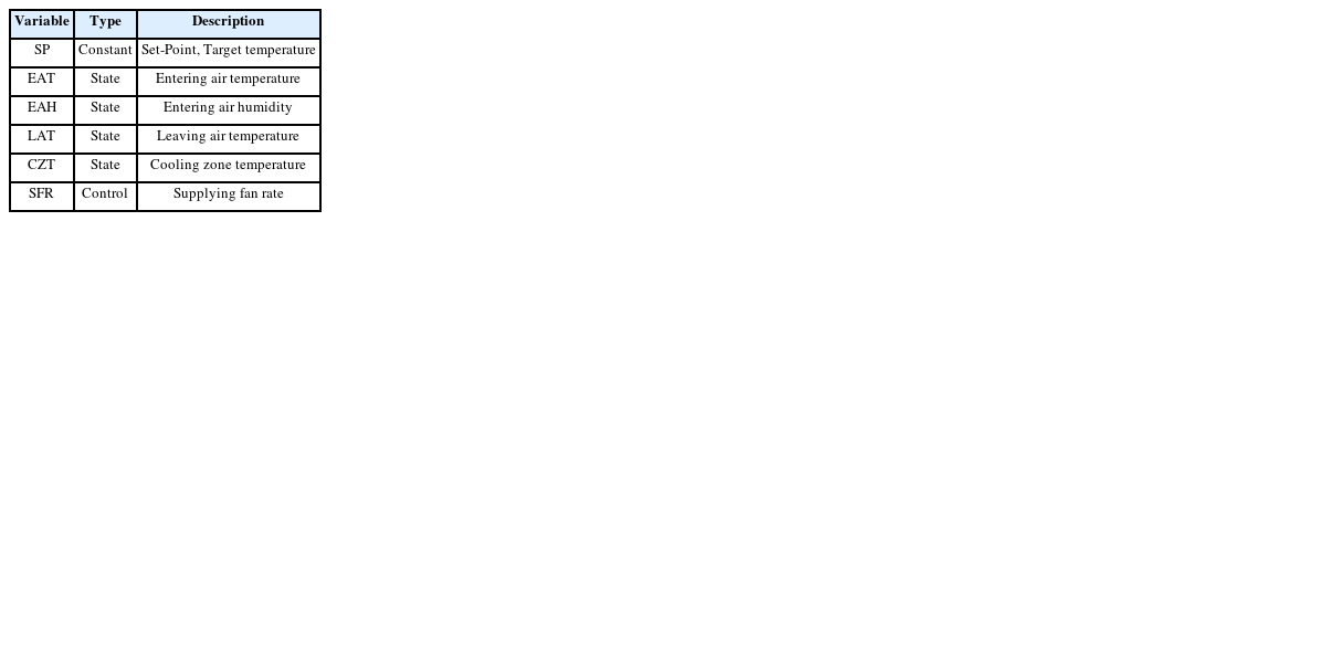 Figs. 2는 서버 룸의 내부 구조를 도식화하여 나타낸 것으로 1의 CZT에 해당하는 영역을 나타내고 있다. 주요 상태변수는 서버 룸의 통로 온도인 SAT 값이며 SAT를 SP보다 낮게 제어하면 DC가 최적의 효율성으로 작동하고 손상을 방지할 수 있다. 따라서 SP 이하의 SAT를 유지하면서 최소의 소비전력을 가지는 냉기공급 팬의 속도를 시간에 따라서 동적으로 자동 제어하는 방법이 필요하다. 각 상태변수와 제어변수에 대한 설명은