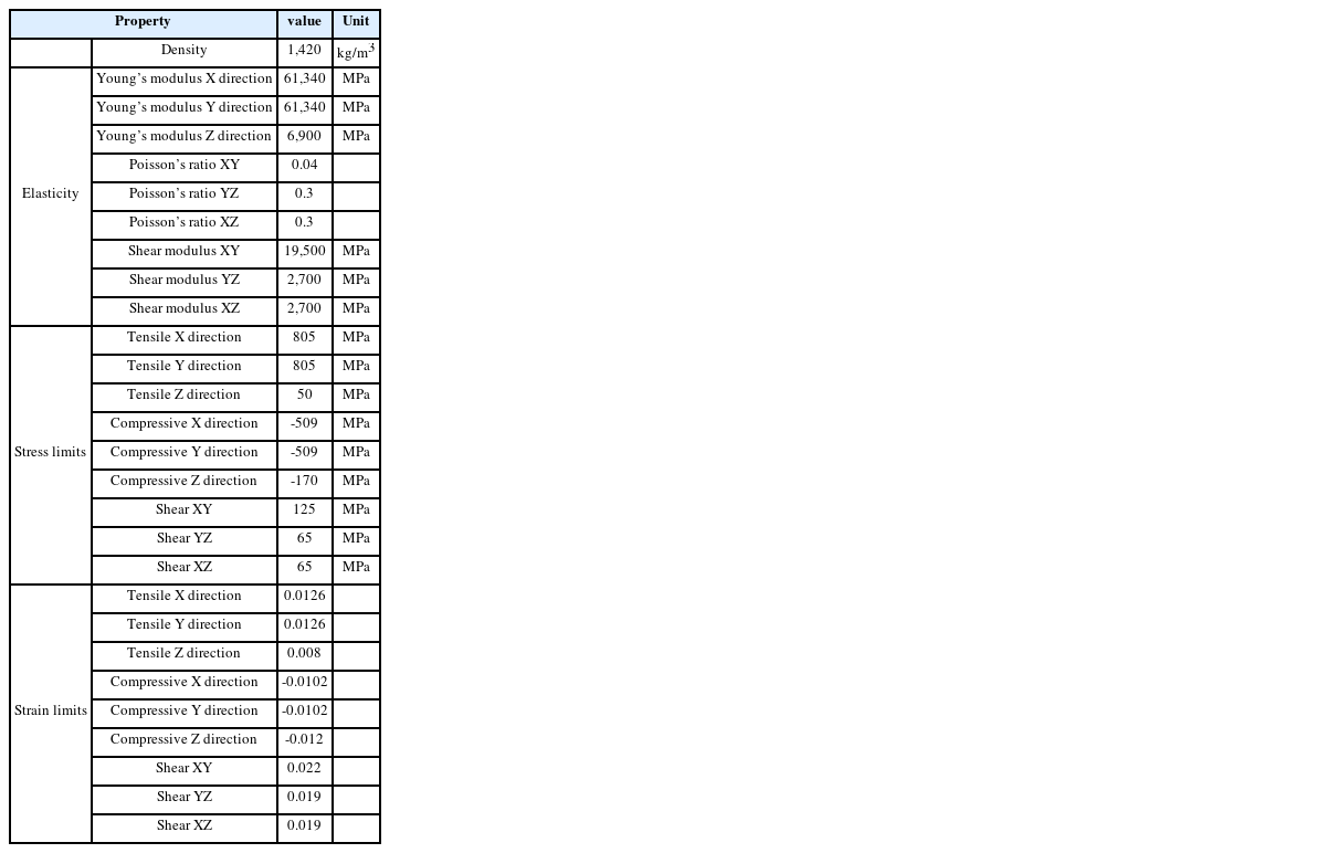 Table 2Material properties of woven carbon fiber prepreg11