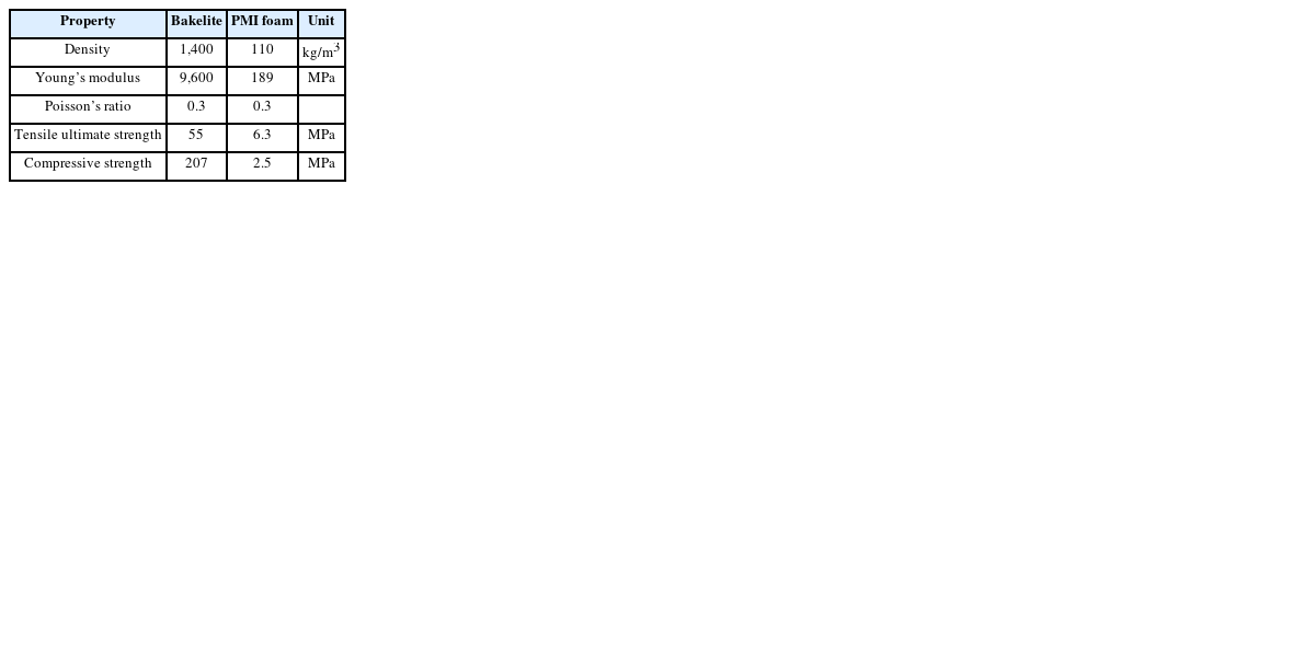 Table 3Material properties of Bakelite and PMI foam12,13
