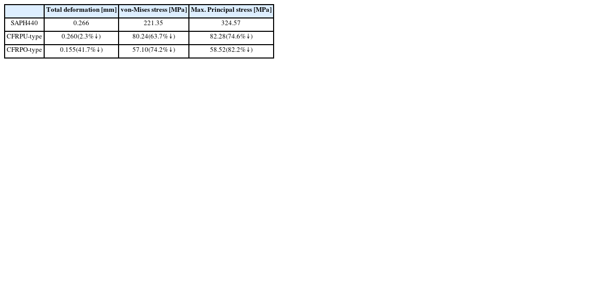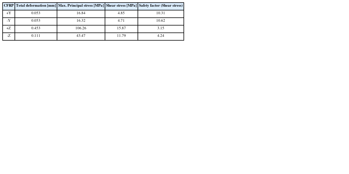 Fig. 6과 같다. 강판 고정 프레임의 구조해석 결과 경향과 동일하게 주행 방향과 주행 역방향의 해석 결과가 비슷하였다. 그리고 상부 고정 프레임의 CFRP 단면적은 하부 고정 프레임의 45.5%이면서 최대변형량은 하부 고정 프레임보다 3.1배 높은 0.453mm를 보였고, 최대주응력에서는 1.4배 높은 106.26 MPa를 보였다. 이는 CFRP의 허용 응력 한계인 805 MPa를 기준으로 7.6의 안전계수를 갖는 낮은 응력이다. 이와 함께 전단응력의 최댓값은 15.87 MPa로 허용 응력 한계인 50 MPa를 기준으로 3.15의 안전계수를 보였다. 이는 파손기준으로 3배의 안전함을 나타내는 수치이다. 하지만 최대주응력 대비 낮은 안전계수이다. 이를 해결하기 위해서는 평직 탄소섬유 프리프레그의 적층을 0°로만 적용하지 말고 45°를 적용한 층을 부여하여 최대주응력과 전단응력 사이의 균형을 맞추는 것이 필요하다.