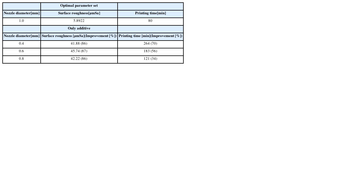 Table 6에 정리하였고, 적층 시간은 23분으로 71% 적은 것으로 나타나 있다. 이를 통해 쾌속 조형이 우선시되어 실험이 진행될 경우 선택적인 1.5 mm 노즐의 사용 또한 고려할 필요가 있다.