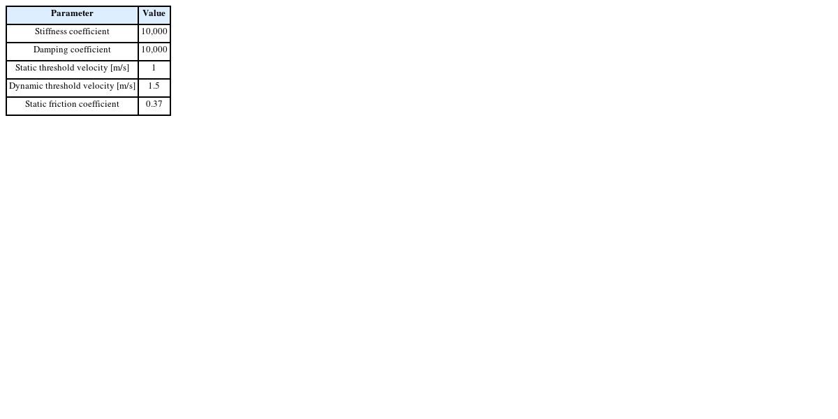 Table 1. The most important setting factors in RecurDyn are the contact characteristics. The stiffness coefficient was set to 10,000. If the stiffness coefficient is set to be quite small, equilibrium is achieved only when the displacement is quite large. Because displacement should not exist, the stiffness coefficient must be sufficiently large. Conversely, if the stiffness coefficient is quite large, the force changes rapidly, which may adversely affect the analysis stability. Subsequently, the damping coefficient was set to 10,000. For friction, the static threshold velocity was set to 1, the dynamic threshold velocity to 1.5, and the static friction coefficient to 0.37.