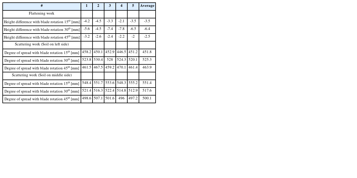The scattering operation experiment was conducted five times for each case. When the soil is concentrated on the left side of the blade, the average distance of the soil spread is 451.8 mm at 15